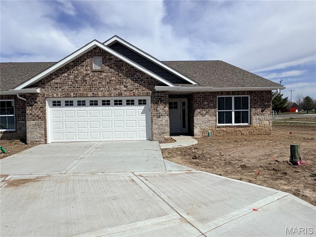 Take advantage of your opportunity to own an UPSCALE new construction villa in the 55+ Serenade Villas community. You'll immediately notice the quality-build when you pull up and see the beautiful brick and stone work on the front of the home. The interior features an OPEN FLOORPLAN with living room and built-in electric fireplace with shiplap surround, kitchen with center island, upgraded cabinetry and granite countertops, dining area, all under the vaulted ceiling offering a nice, airy feel. The primary suite offers a bath with dual vanities, walk-in closet and a tiled walk-in shower. There's also a 2nd bedroom + 3rd bedroom/office option. Enjoy the outdoors and fresh air relaxing on your covered patio with an AMAZING view of the park. Features include NO STEPS throughout the home, luxury vinyl plank and ceramic tile flooring, 2-car garage with storage area and more. The location is ideal, near shopping, parks, STOCKED pond, walking trail, dining and interstates.